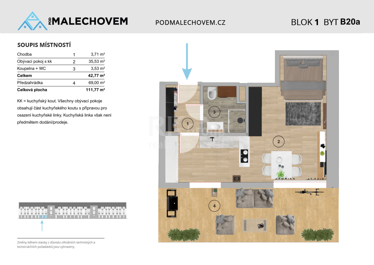 1B23b Prodej bytu, 1+kk, 37.42m2 + balkón 8.01m², projekt Pod Malechovem, Český Brod