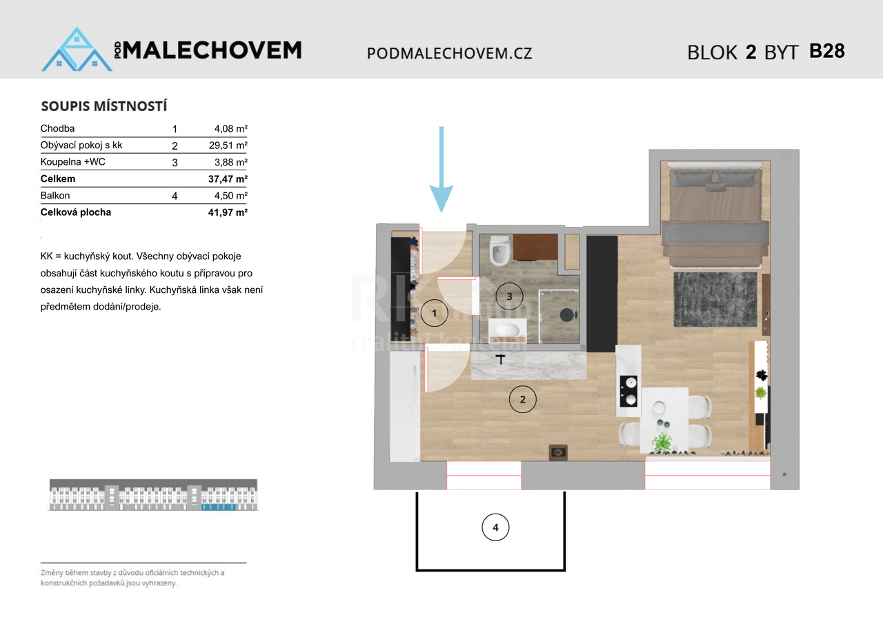 Prodej bytu 2B28, 1+kk, 37.47m² + balkón 4.5m² , projekt Pod Malechovem, Český Brod