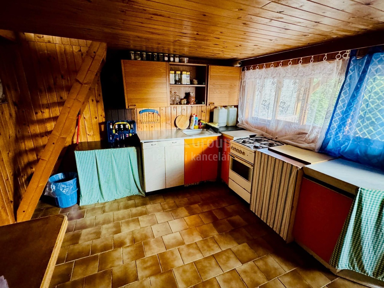 • Přízemí: Dominantou je útulný, dřevem obložený interiér s praktickou dlažbou. Najdete zde plně funkční kuchyňský kout s plynovým sporákem, dřezem a dostatkem úložných prostor. Jídelní část s masivním stolem plynule navazuje na verandu.
