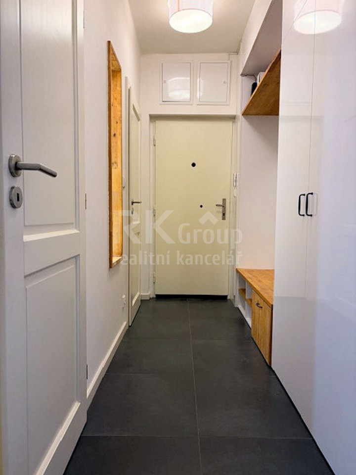 Byt má praktickou dispozici s prostorným kuchyňským koutem s vestavěnými spotřebiči kromě myčky, navazujícím na obývací část. Jedna ložnice má přímý vstup na balkon, druhá je menší a ideální k využití jako pracovna, dětský pokoj či pokoj pro hosty. Koupelna je prosvětlená luxferami, působí vzdušně a...